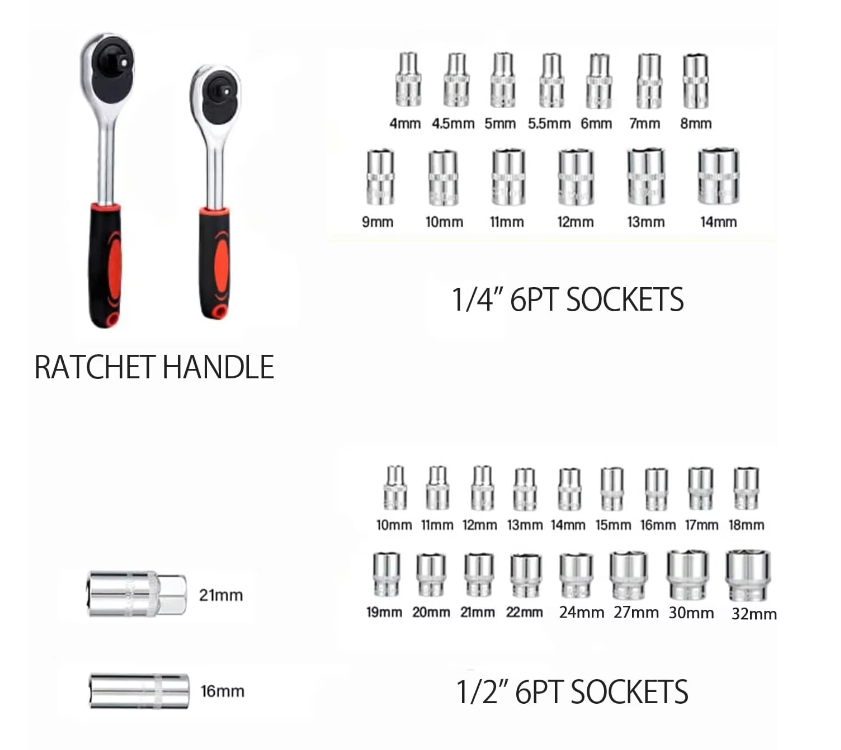 Material:Chrome Vanadium Steel (CR-V) / High-Carbon Steel (for main tools)