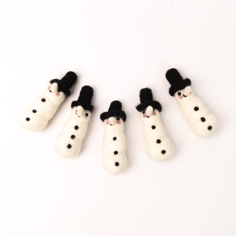 10cm Felt White Mini Snowman with Black Hat For Christmas Room Decor Ornament Purely Hand-felted by Nepalese Artisan