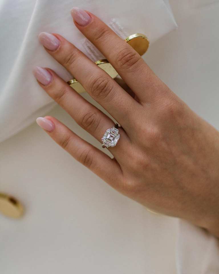 10mm Asscher Cut Diamond Minimalist Engagement Ring | Three Stone Trapezoid Sides Sterling Silver 18K Gold Plated | Women's
