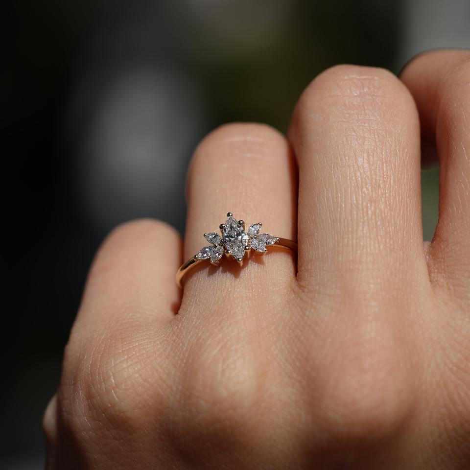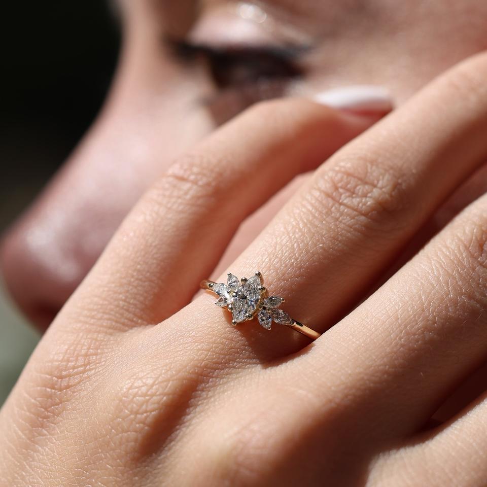 10x5mm Marquise Cut Diamond Sterling Silver 18K Gold Plated Engagement Ring with Marquise Side Stones | Unique Bridal Jewelry