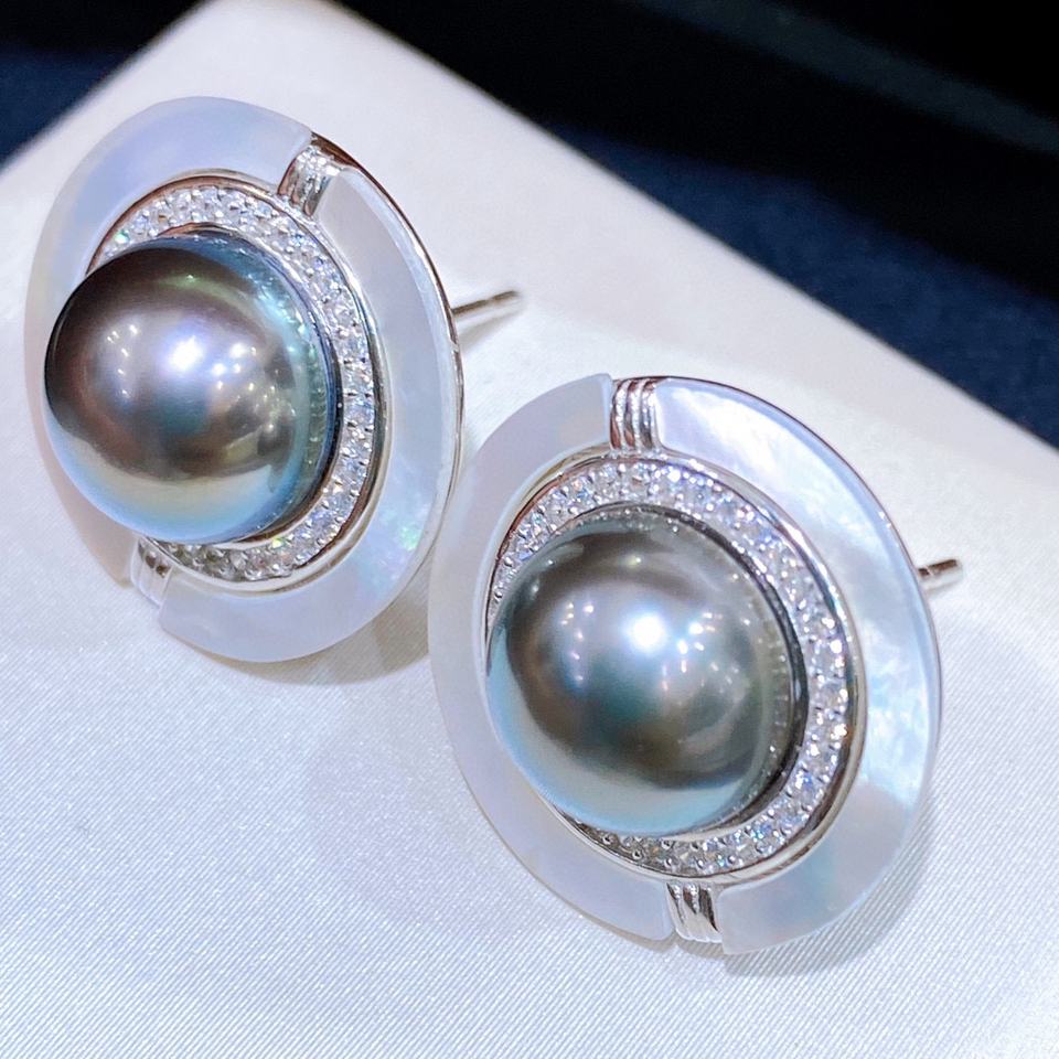 11-12mm Nearly Round Front Flawless 925 Silver Luxury Stud Earrings with Natural Gold Beads Light Luxury Design for Gift