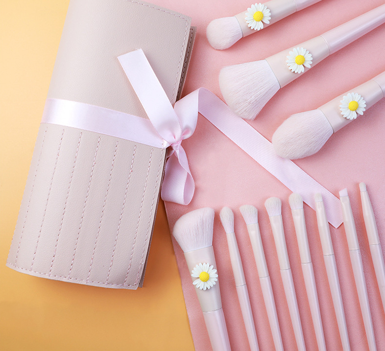 11 Pcs Professional Synthetic Hair Wood Handle Daisy Flower Pink Makeup Brush Set with PU Bag for Concealer & Face