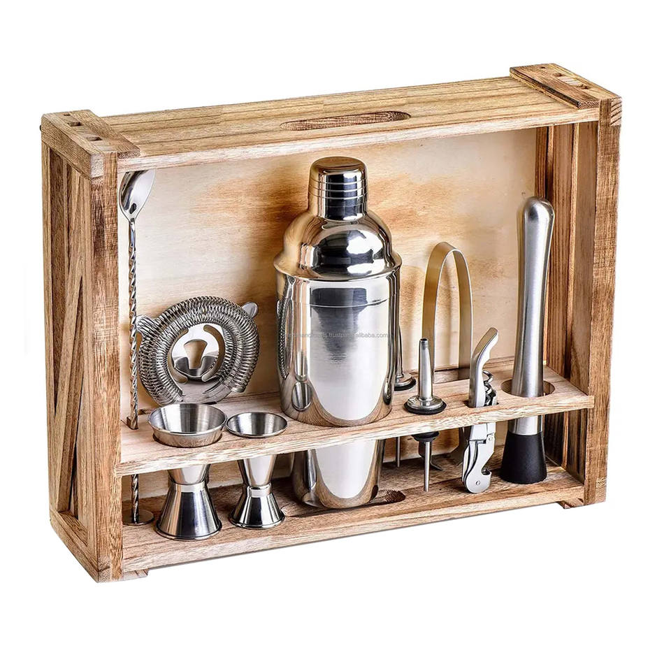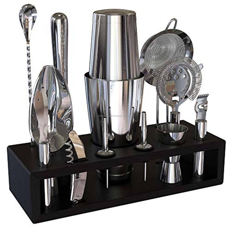 11 Piece Silver Finished Bar Set Cocktail Shaker Set with Wood Stand Perfect Home Bartending Kit with Gun Metal Bar Tools