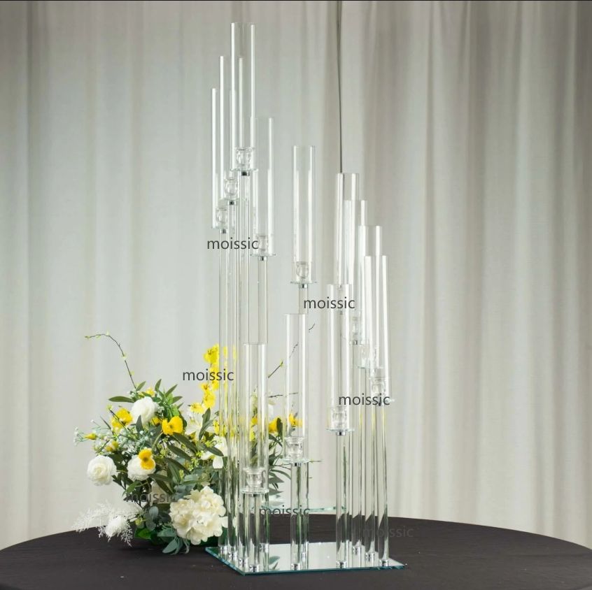 12-Arm Crystal Glass Cluster Candelabra Pedestal Stand 4.5ft Square Hurricane Taper Candle Holder Wedding Table Centerpiece