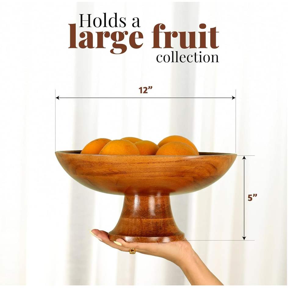 12-Inch Premium Acacia Wood Fruit Bowl Pedestal Stand Large Decorative Serving Bowl for Kitchen Dining Art Deco Wedding Diwali