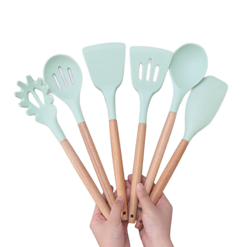 12-Piece Non-Stick Silicone Kitchenware Set Wooden Handle Multi-Function Utensils Including Frying Pan Soup Spoon Rice Spoon