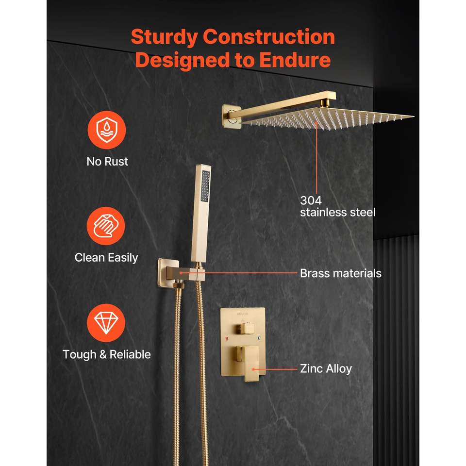 12\" Square Rain Shower Head and Hand Set Brushed Gold Finish Premium Quality Faucet Set