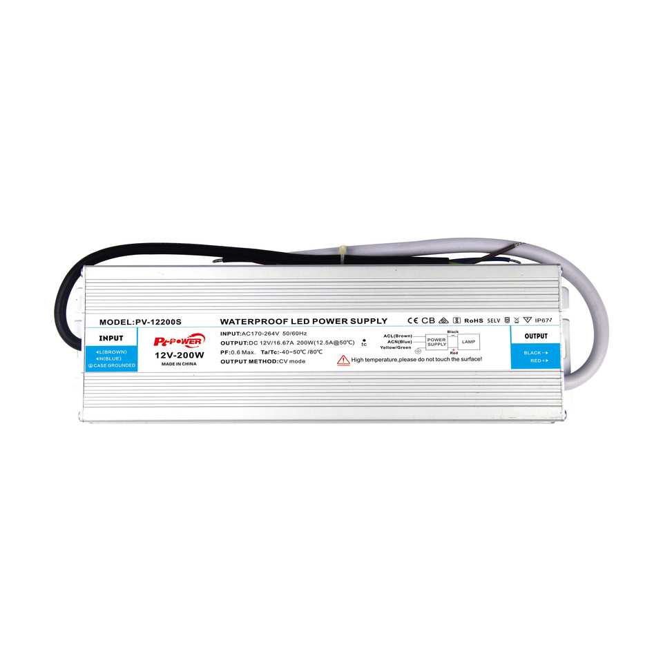 CE/CB/SAA/RoHS Listed 200W EMC Constant Voltage LED Strip Driver 170-264VAC 12V/24VDC IP67 Waterproof LED Light Box Power Supply