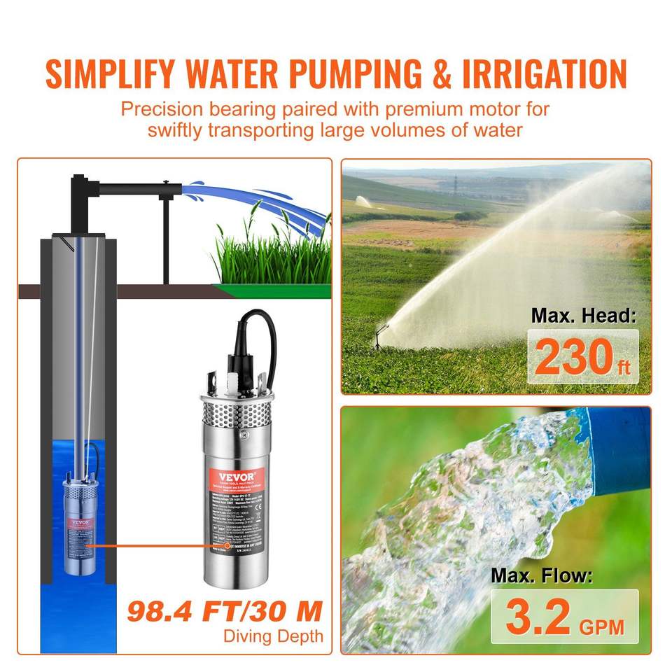 12V DC 120W Solar Water Pump Submersible Deep Well Pump Max Flow 3.2 GPM Max Head 230 ft for Farm Ranch Irrigation Livestock