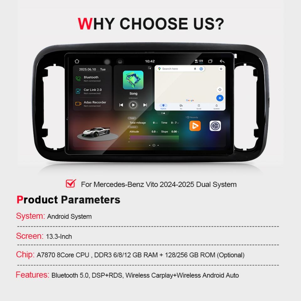 13.3" Android Touch Screen Multimedia Car Stereo for Mercedes-Benz Vito 2024-2025 Dual System Head Unit Navigation CarPlay
