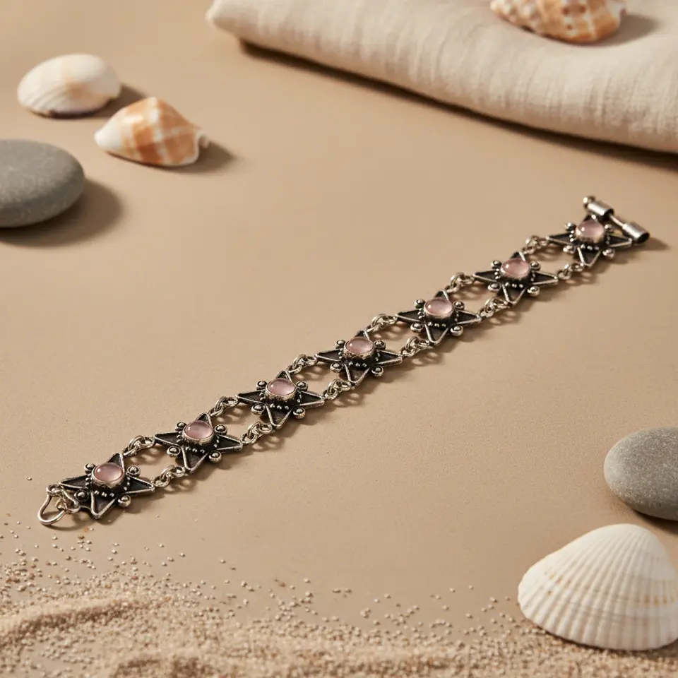 14K Gold 925 Silver Rose Quartz Bracelet for Women Statement Religious Jewelry Diamond Pearl Rhodium Plated Flower Pattern