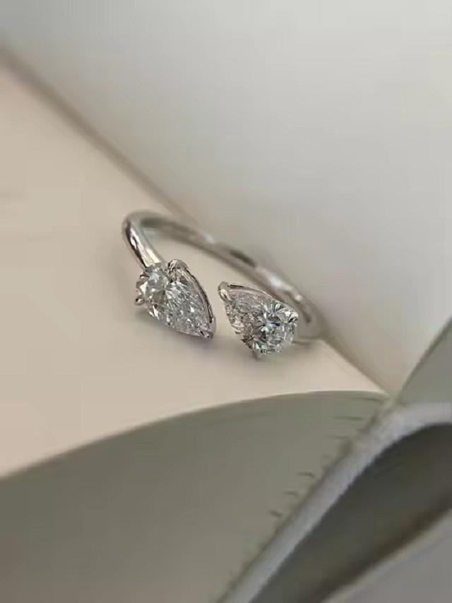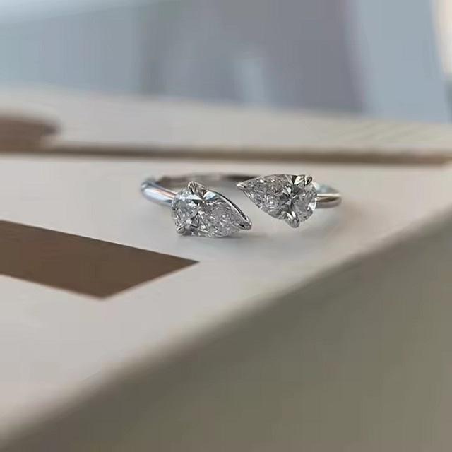 14K Gold Bypass Shank Two Stone Ring Minimalist Open Band With Pear Lab Grown Diamond Engagement Anniversary Gift Wedding Party