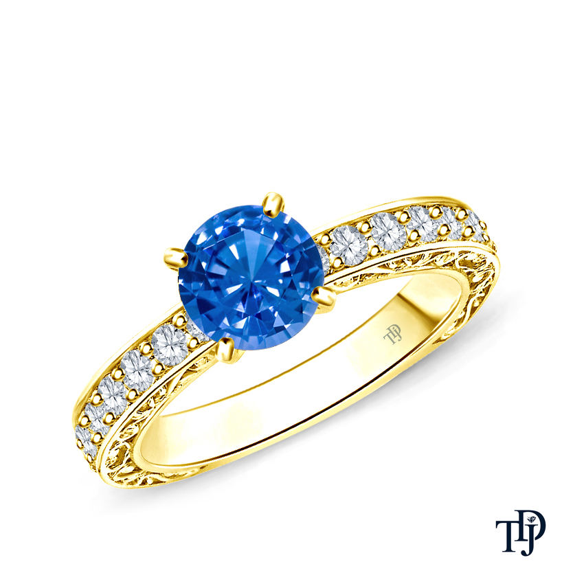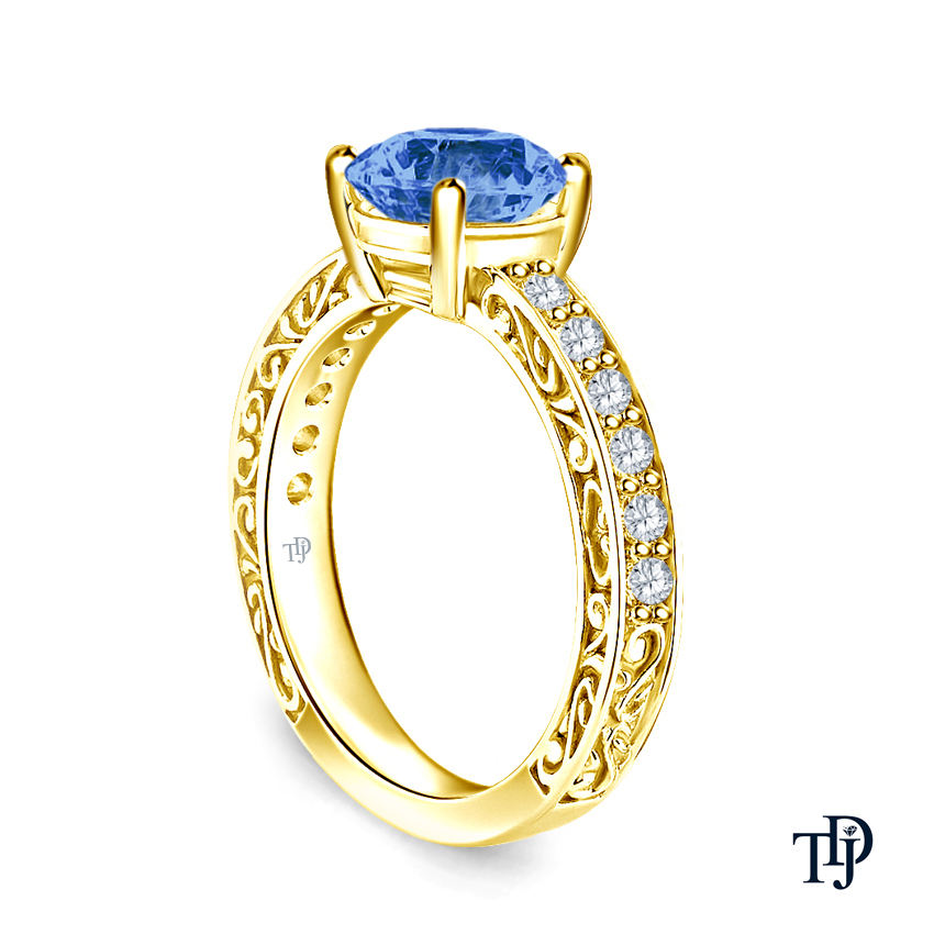14K Gold Luxury Blue Sapphire Engagement Ring With Detailed Scroll Accents