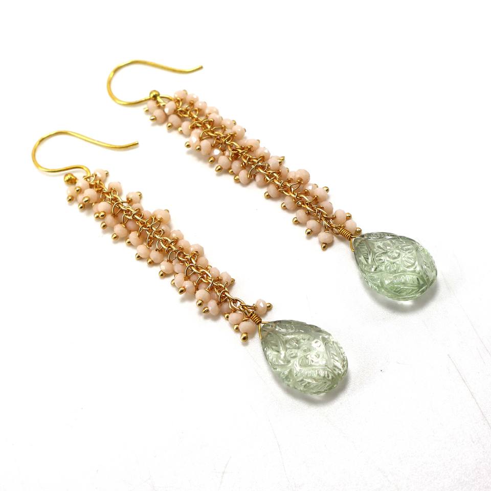 14K Gold Natural Green Amethyst Flower Carving Pear Earrings Pink Chalcedony Faceted Long Dangle Earrings Cluster Earring