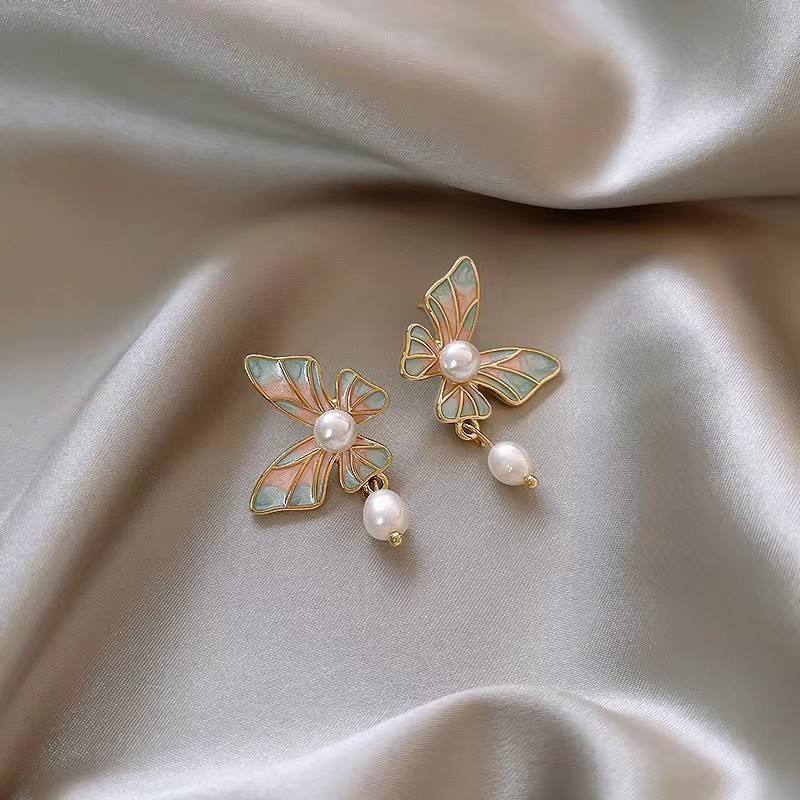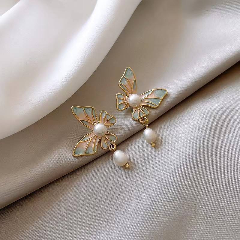14K Gold S925 Pure Silver Freshwater Jewelry Earrings Retro Enamel Oil Painting Style Light Luxury Butterfly Dangle Earrings