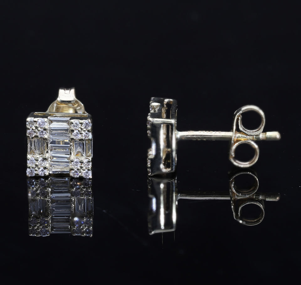 14K Gold Square Stud Earrings Featuring Natural Round & Baguette Diamonds in Elegant Geometric Cluster Prong and Channel Setting