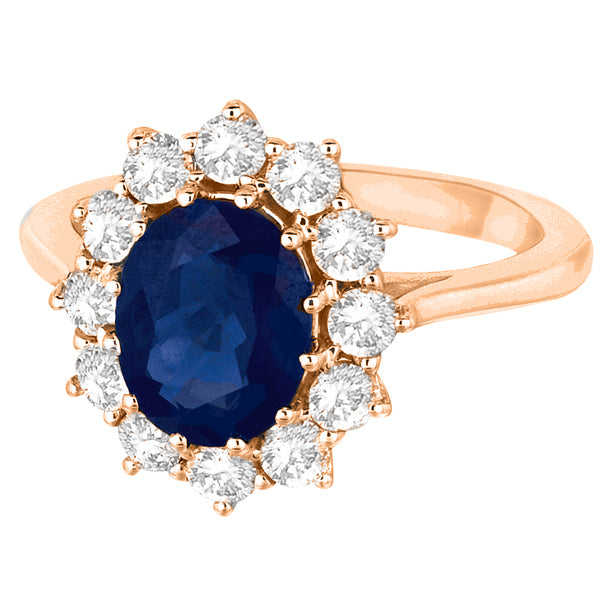 14K Rose Gold Oval Blue Sapphire & Diamond Accented Statement Ring 3.60ctw Natural Stone Fine Jewelry with Cut Inlay Technology