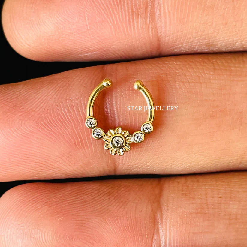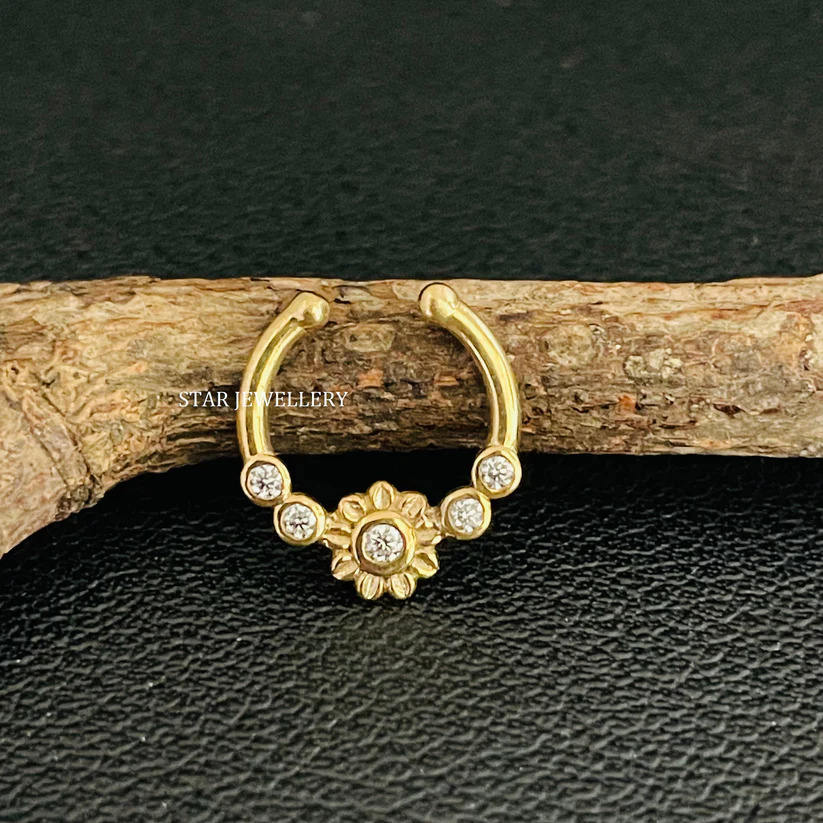 14K Solid Gold Bezel Set Natural Diamond Flower Fake Daith Piercing Fine Jewelry.
