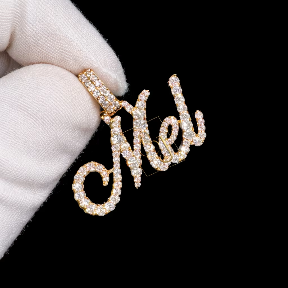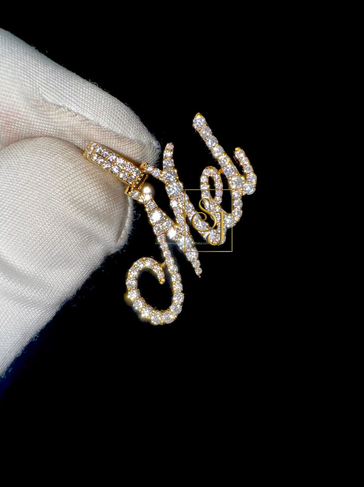 14K Solid Gold Cursive Initial Letter Name Pendant Custom Iced Charm Necklace Diamond Personalized Trendy Unisex Children's Gift
