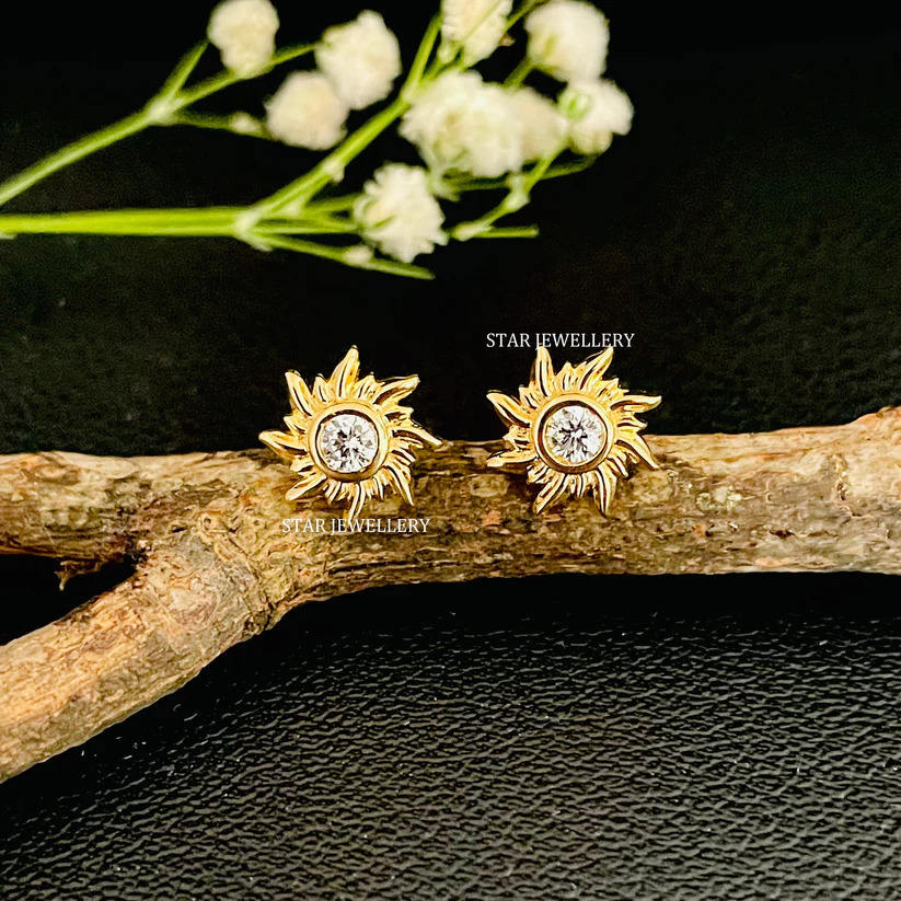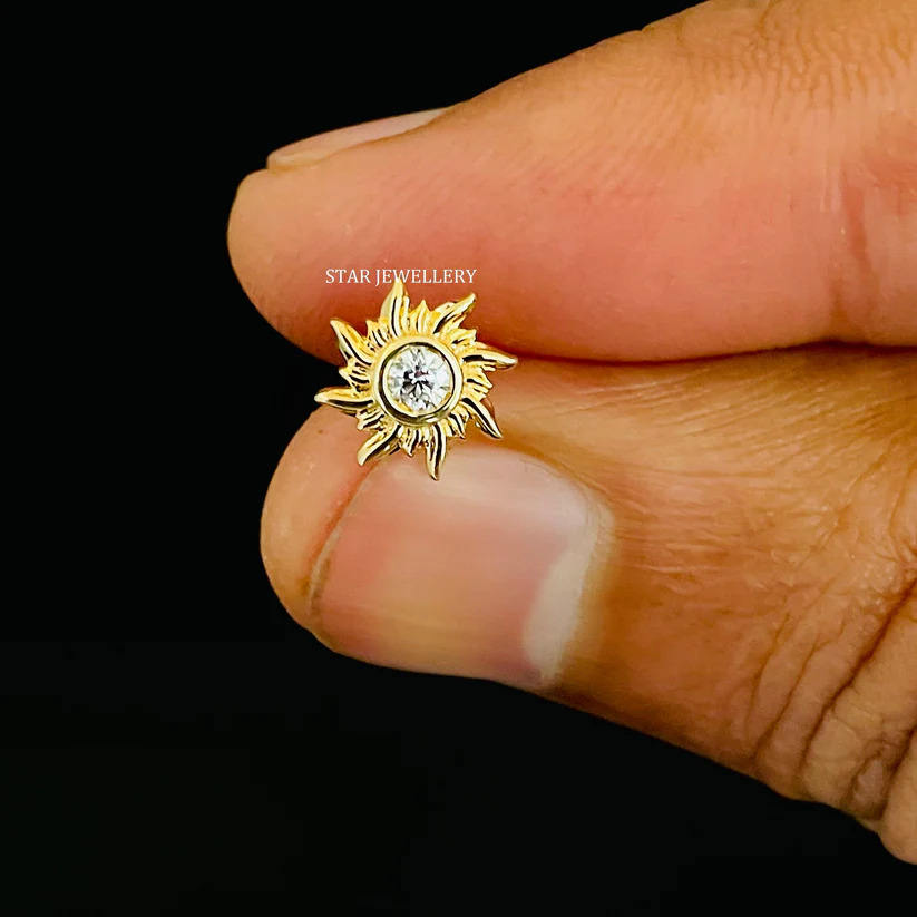 14K Solid Gold Genuine Natural Diamond Sun Piercing Fine Jewelry.