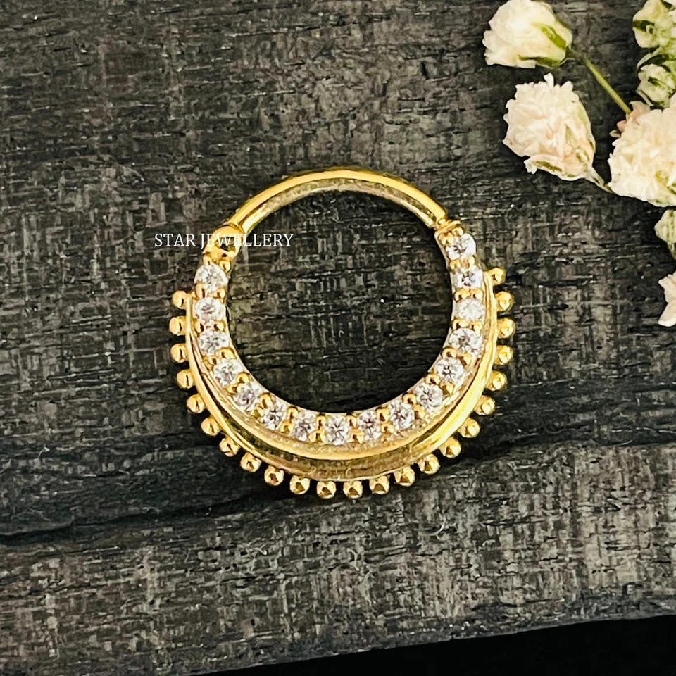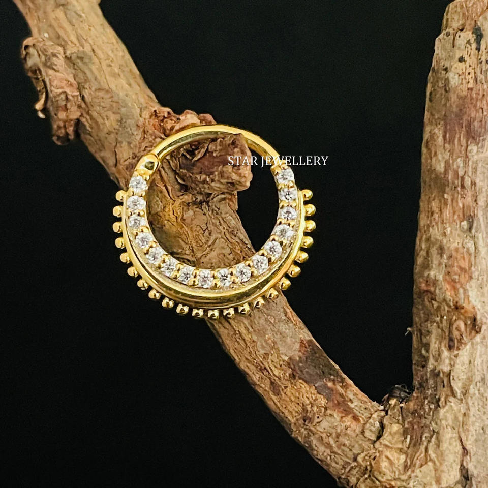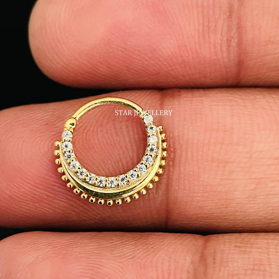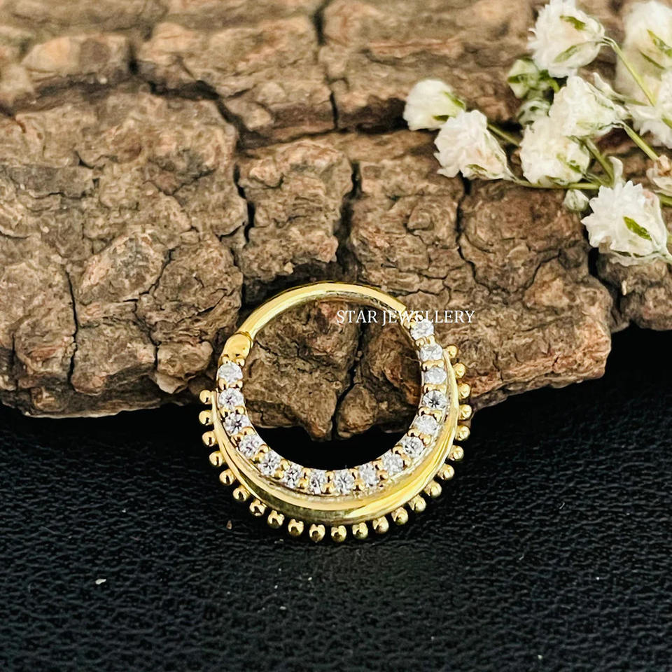 14K Solid Gold Natural Diamond Miligrain Septum Clicker Fine Jewelry.