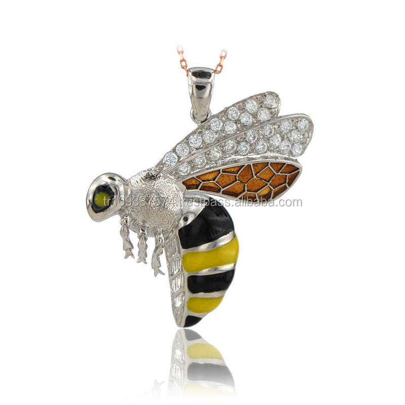 14K Solid White Gold Bee Pendant Necklace for Women Vintage Enamel Bee Charm with Zircon Fine Jewelry for Weddings Made Turkey