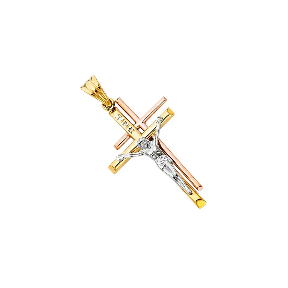 14K Tri-Color Gold Plated Crucifix Jesus Cross Pendant Multitone Religious Christian Design Zircon Diamond Stone for Children