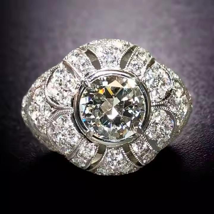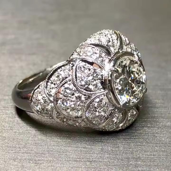 14K White Gold Deco Old European Scalloped Cocktail Ring 2CT Lab Grown Diamond Dome Engagement Cut Bezel Setting for Wedding