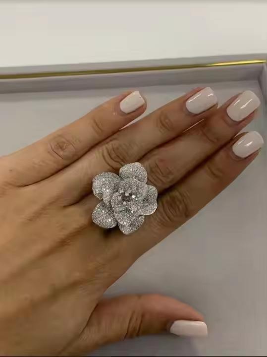 14K White Gold Diamond Flower Ring Pave Set handmade lab grown diamond Round Cut Cocktail Statement engagement Gift For Her