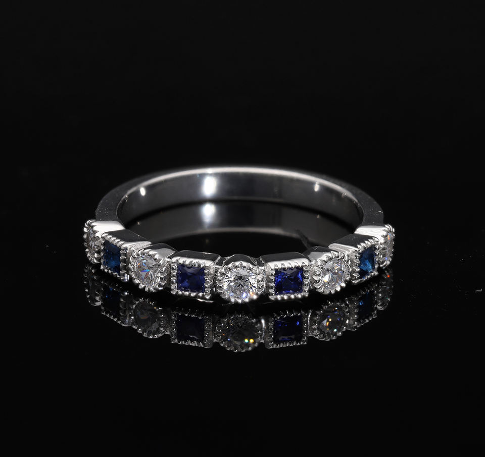14K White Gold Ring with Natural Round Diamonds and Blue Sapphires in Alternating Vintage Bezel Setting with Milgrain Detailing
