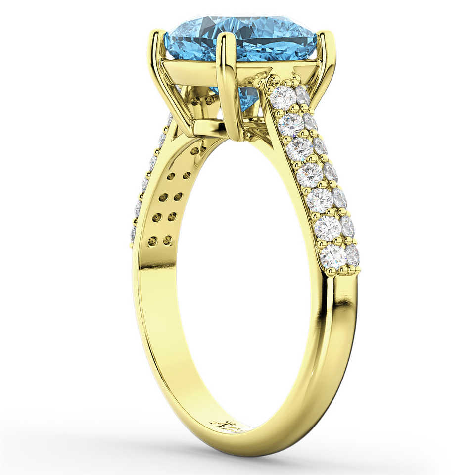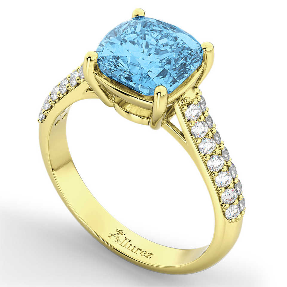 14K Yellow Gold Cushion Cut Blue Topaz & Diamond Ring 4.42ct-Elegant Diamond Rings Collection