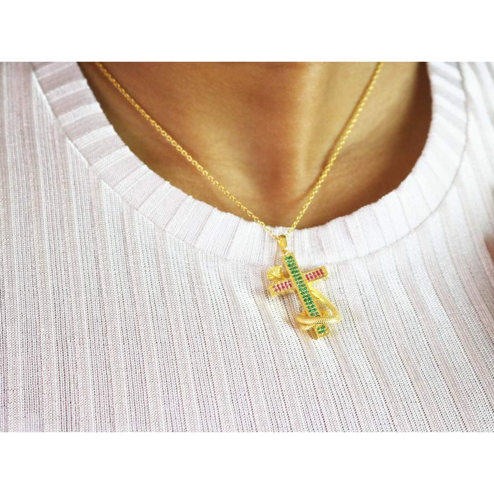14K Yellow Gold Snake Cross Pendant Necklace with Natural Ruby and Emerald Fine Jewelry Necklace