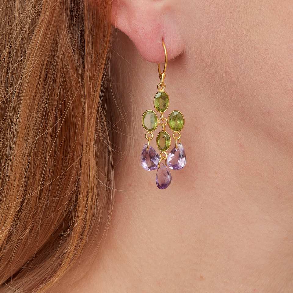 14k Gold Plated Minimalist Birthstone Amethyst and Green Peridot Gemstone Gold Plated Dangly Drop Earring Jewelry for Women Girl