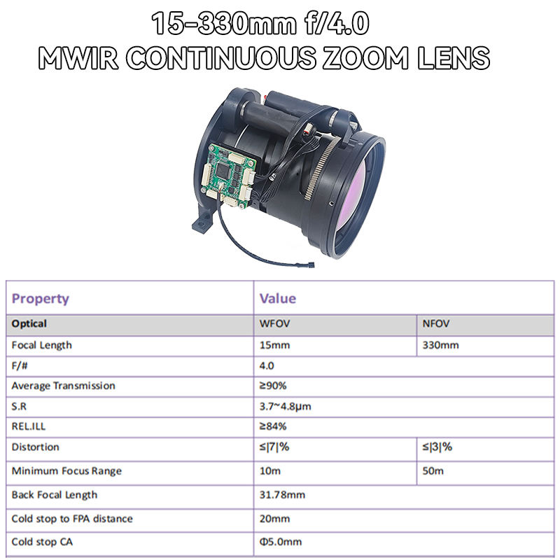 15-330mm MWIR Continuous Zoom Thermal Imaging Infrared Lens F4.0 90% Transmission OEM Customizable Night Patrols 3.7-4.8m IP67