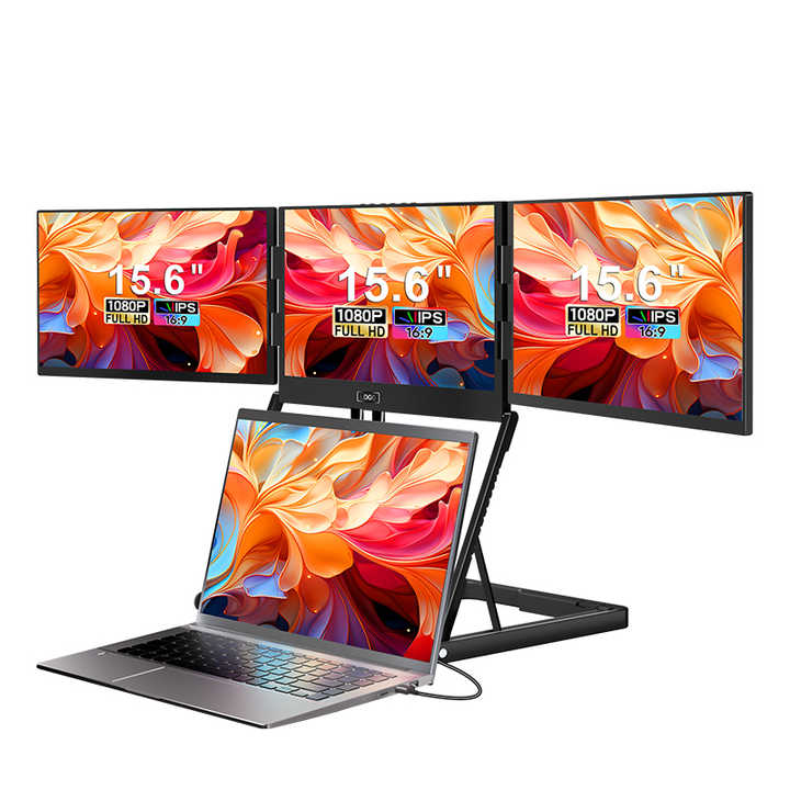15.6 Inch Portable Quad Monitor for Laptop 1 Cable for 3 Screens Horizontal Screen Adjustable Stand Raises to Eye Level