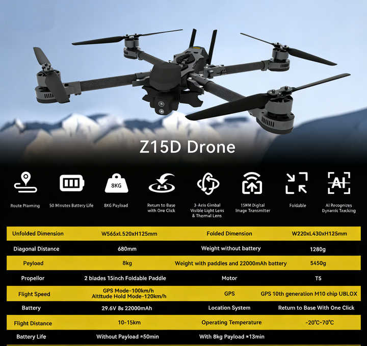 15 Inch racing AI Intelligent Obstacle Avoidance Z15D drone GPS Brushless 8K 50 Minutes UAV for 10KM Flight Professional RC UAV