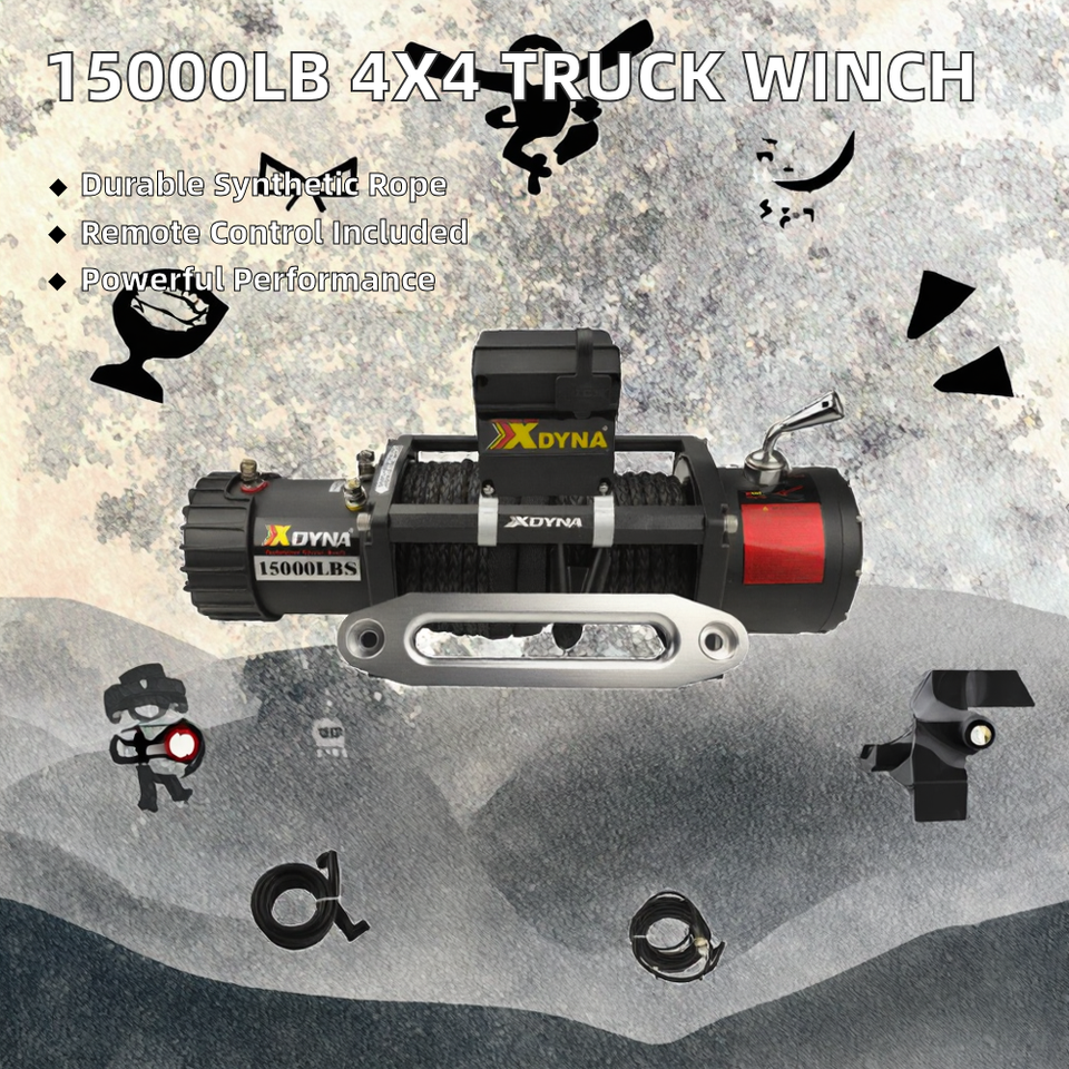 15000lb 6.6HP 4x4 Off-Road Truck Winch 24V Electric Remote Control 25m Lifting Height Synthetic Rope Aluminum Construction