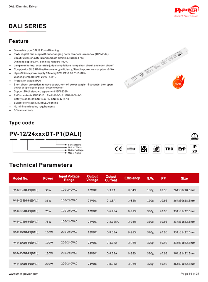 150W DALI Push 2 in 1 Dimmable LED Switching Power Supply Transformer 200-240V AC-DC 24V Indoor IP20 CV LED Strip Driver Single