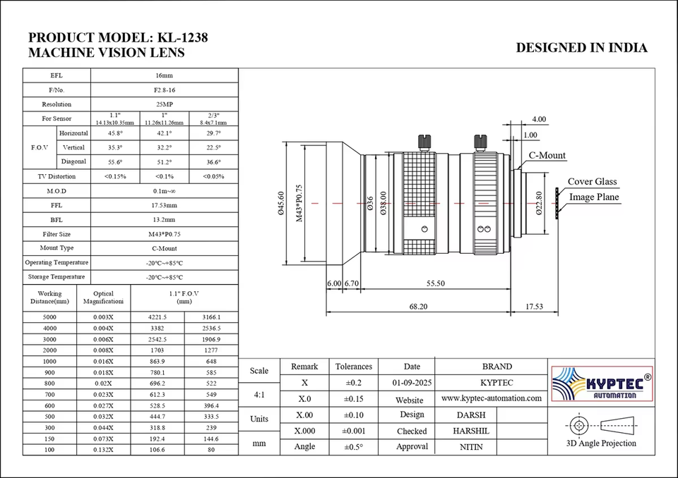 16 MM Machine Vision Lens With 25 MegaPixel & 1.1" Format Lens For Smart Camera Systems From India