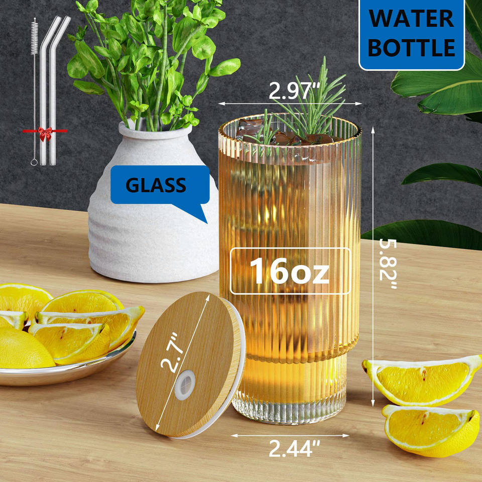 16 OZ Ribbed Glass Bottle Cup with Straw and Lid for Whiskey Cocktail Beer Iced Coffee Cups Glass Tumbler