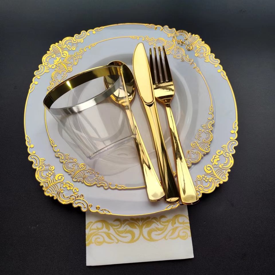 175PCS White and Gold Plastic Plates Include 25 Dinner Plates 25 Dessert Plates 25Forks 25Spoons 25Knives 25Cups 25Napkins
