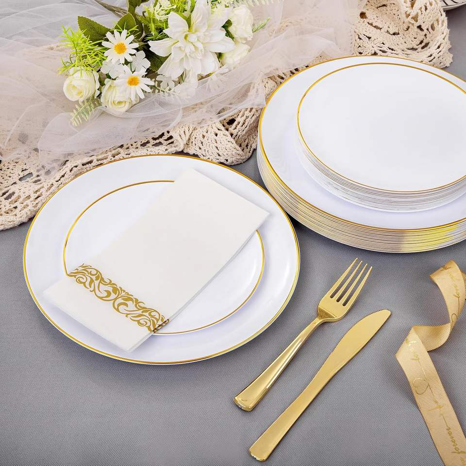 175pcs Luxury Gold Rimmed Banquet Cutlery Set High Quality Disposable Plastic Tableware for Wedding Parties for Hotels