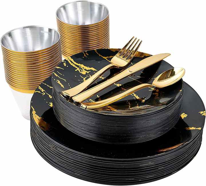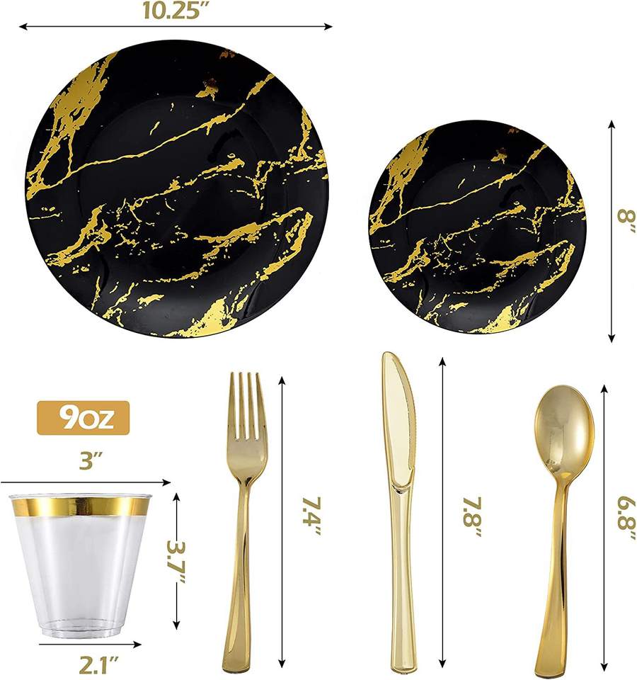 175pcs/ Sets of Tableware New Black Disc Hot Gold Marble Wine Glass Knife Fork Spoon