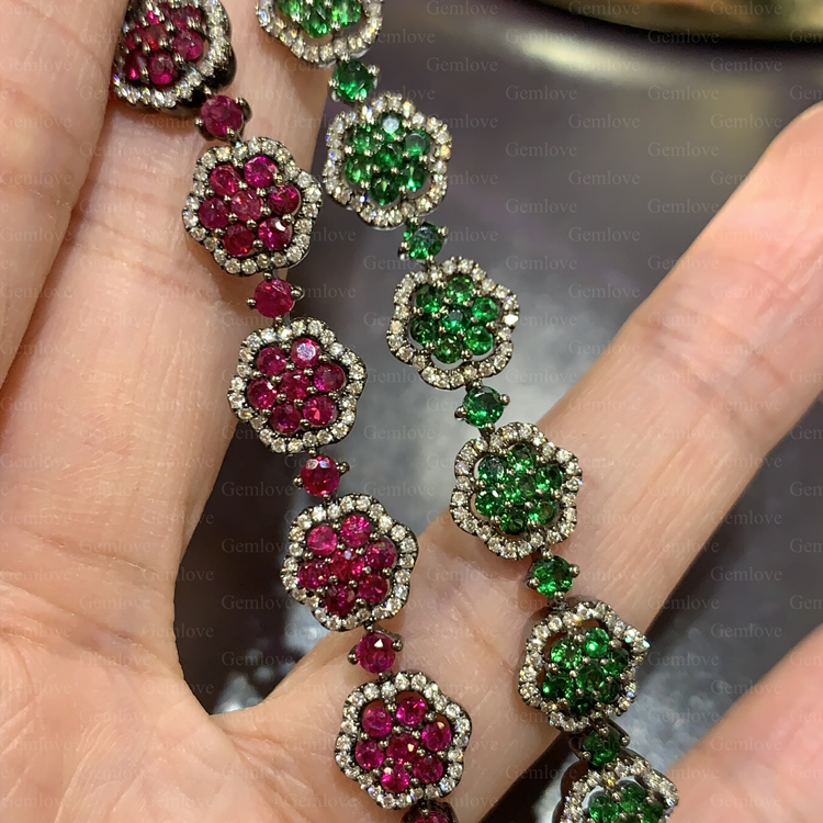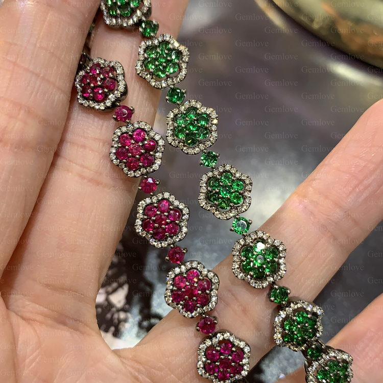 18K Gold Luxury Diamond Floral Bracelet (Ladies' Style) Featuring Lab-Grown Round Rubies, Radiant Evening Jewellery