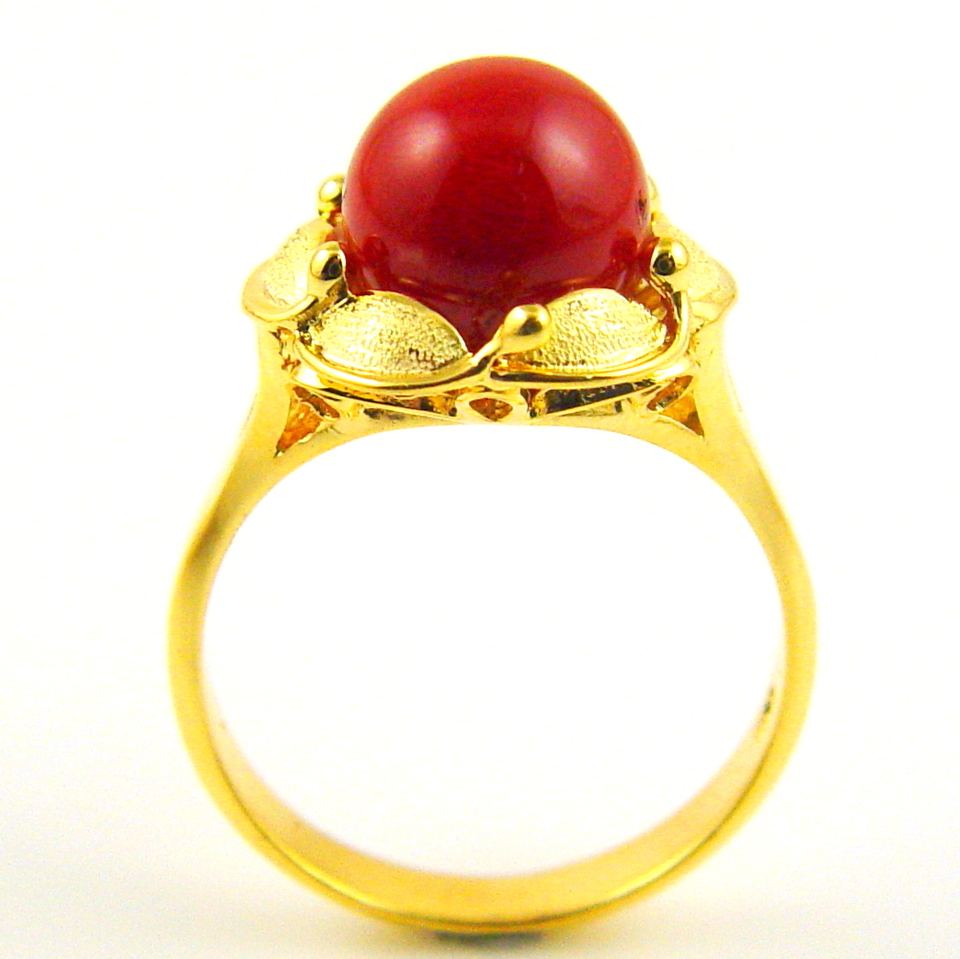 18K Gold Natural Red Coral Round Bead Gemstone Ring Fashionable Accessory