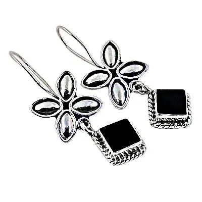 18K Gold Plated 925 Silver Flower Drop Earrings with Black Stone Women's Jewelry for Weddings & Parties