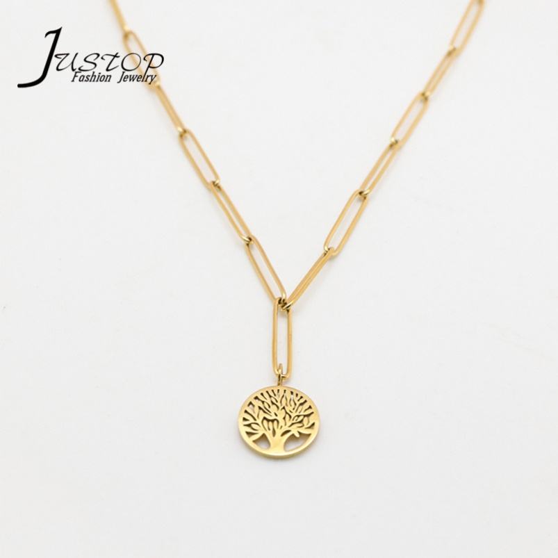 18K Gold Plated Environmental Friendly Trendy Geometric Life Tree Stainless Steel Clavicle Chain Pendant Necklace for Women