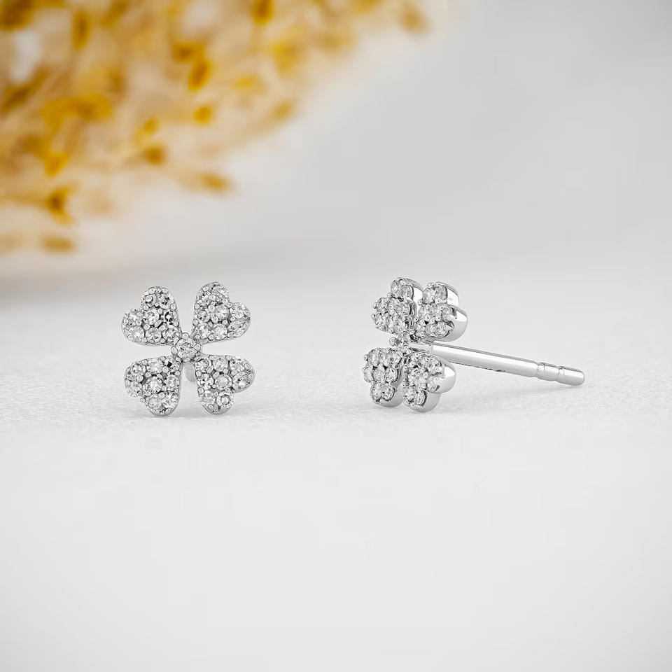18K Pure Gold or Silver Lab Diamond Small Heart Shape Floral Design Stud Earrings Micro Pave Set Diamond Everyday Use for Girls