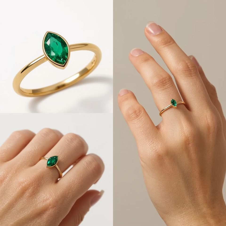18K Solid Yellow Gold Marquise Emerald Ring Women Fine Jewelry Minimalist Real Gemstone Ring