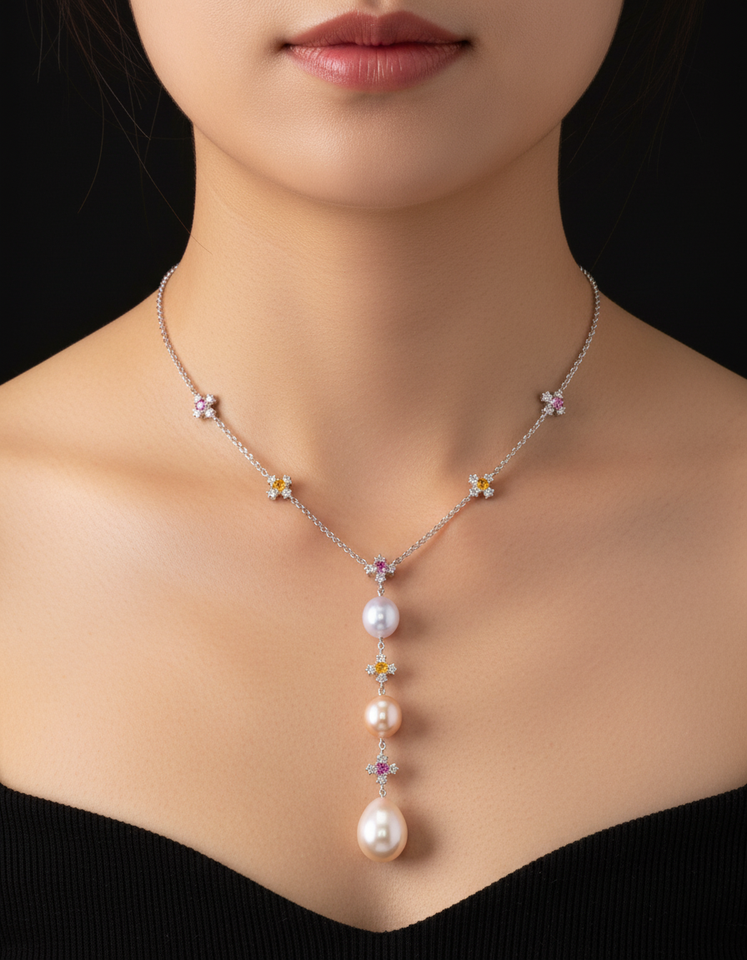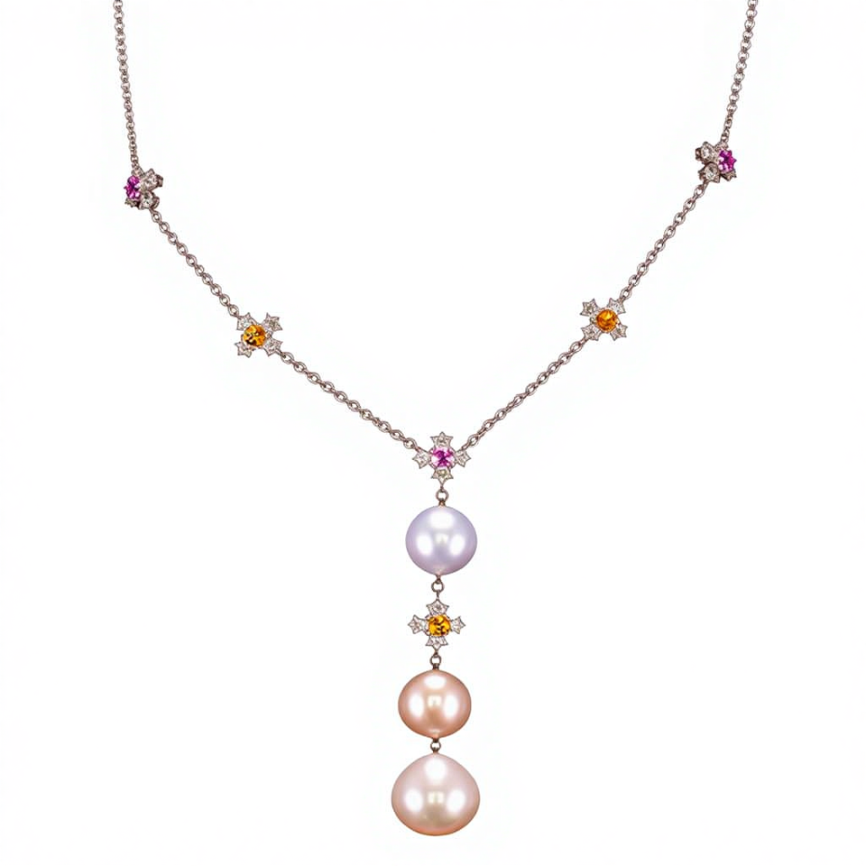 18K White Gold Charm Multi Gemstone Necklace South Sea Mixed Pearls AA Grade Yellow Pink Sapphires-Luxury Women's Jewelry